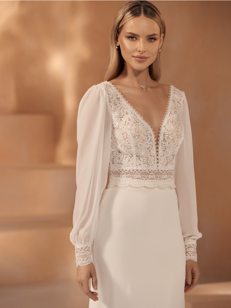 This beautiful bolero is perfect for your wedding day. The top is made from lovely lace and chiffon and is full-sleeved. The bolero has a V-neckline on the front and back.