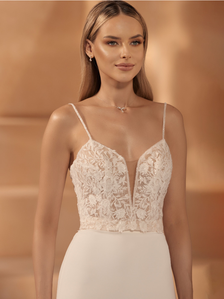 This beautiful bolero is perfect for your wedding day. The top is made from lovely lace and is sleeveless. It has straps and a sweatheart neckline. The top closes with a hidden zipper. You can match this top perfectly with the Makira Skirt.