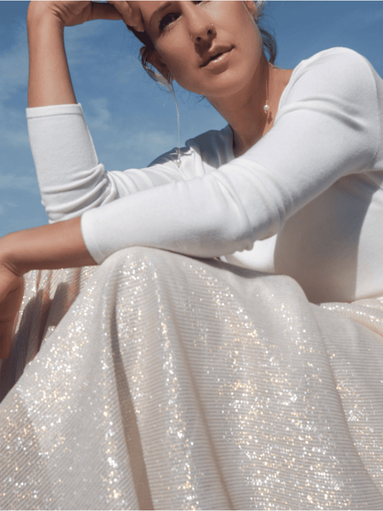 This beautiful R5634 skirt is a shiny pleated bridal skirt. This lovely skirt is made from flowing pleated ivory knitted fabric, interspersed with gold and silver lurex threads. There is elastic lining and a comfortable elastic band on the waistband. The skirt has a raw edge on the hem, so the length can be easily shortened.