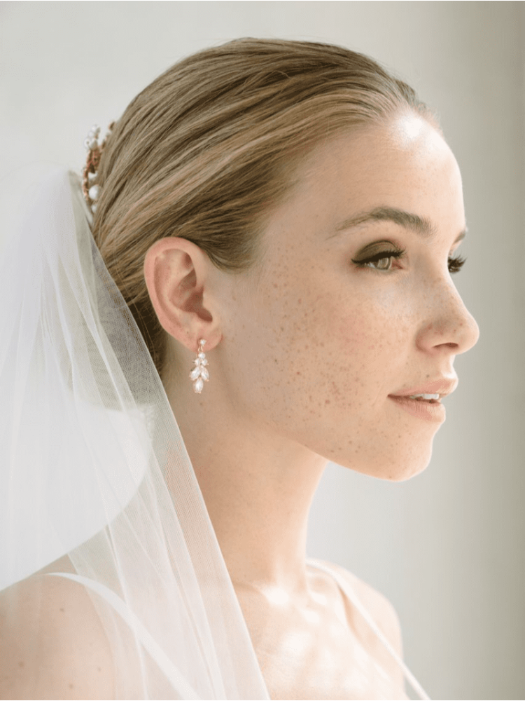 These lovely Rose Gold earrings are composed of a stunning arrangement of sparkling Cubic Zirconia stones. The rose-gold plated earrings will dazzle on your special day and give that finishing touch to your bridal outfit. The earrings have a length of 2,7 cm. These earrings are also available in Silver.