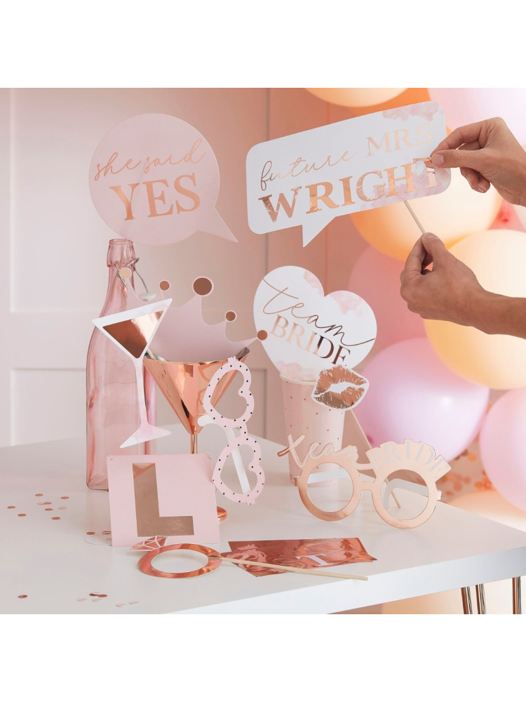 Contents: Each package contains 10 props, including: 1x Future Mrs, 1x Team Bride glasses, 1x heart glasses, 1x lips, 1x cocktail glass, 1x diamond ring, 1 x Team Bride, 1x crown, 1x She Said Yes and 1 x text plate and 2 sheets with rose gold letters to personalize the text sign.