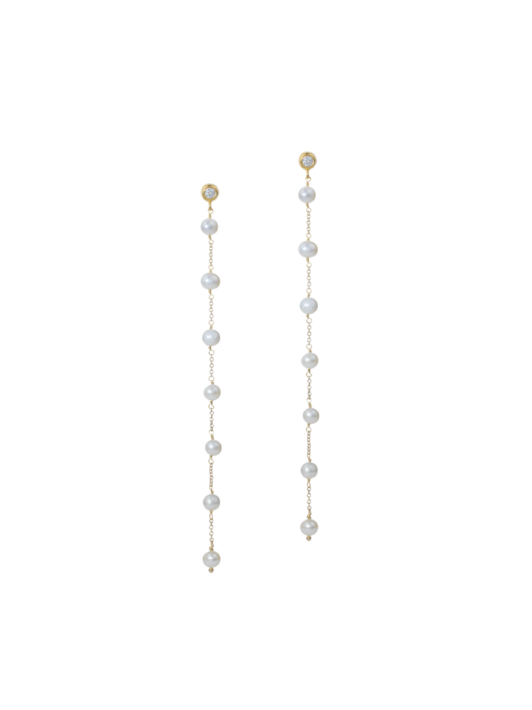 It's YOUR day, YOUR jewelry – and these extravagant, extra-long earrings are designed to make an unforgettable statement at your wedding. Featuring a sparkling crystal stud and seven freshwater pearls on each side, this contemporary piece, despite its minimalist design, will continue to elevate outfits like a little black dress or a "jeans and white blouse" look long after the wedding.