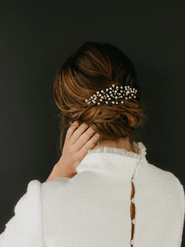 The Abel hair comb by Lizeron is a lightweight, handcrafted hair accessory designed to gracefully sit atop your updo. Each porcelain element is meticulously crafted in Lizeron’s workshop, featuring both matte and pearlescent finishes to add subtle light reflections.