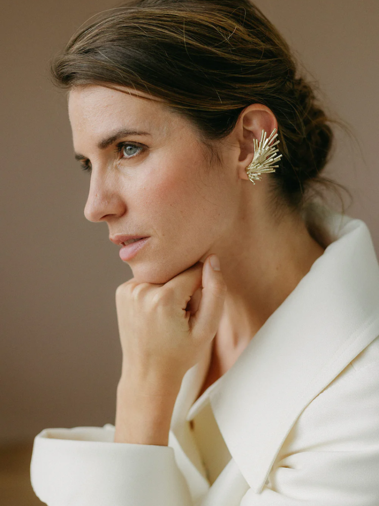 The Iris earrings by Lizeron blend vintage charm with contemporary elegance. Inspired by a brooch discovered at a French flea market, their design curves delicately along the ear. Handcrafted in Paris and plated with fine gold, these ear cuffs fasten securely with a top clip and silver post for added comfort. A bold yet refined statement for bridal and special occasions.
