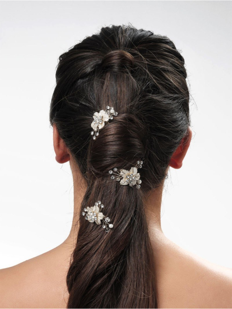 These 3 decorative haircombs are decorated with ivory-colored pearls and rhinestones. The pins can be used in various ways in different hairstyles during your wessing, in both loose, updo and braided hair.